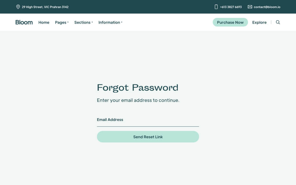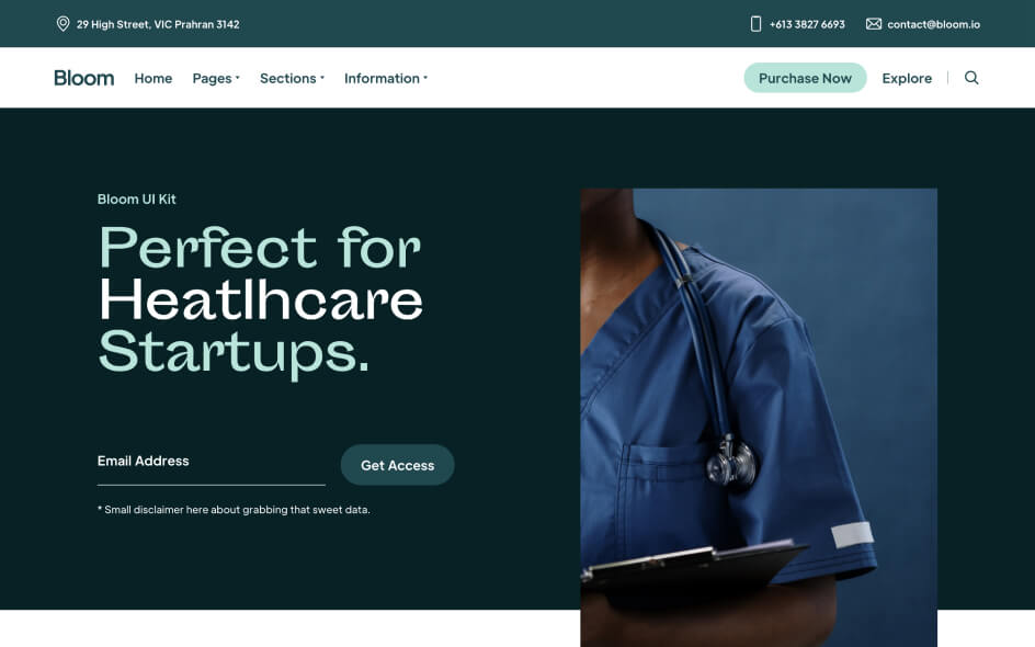 Bloom’s bold, professional tone is well suited to health-tech startups and can be used to freshen-up established health clinic sites where a welcoming, reassuring approach is required.